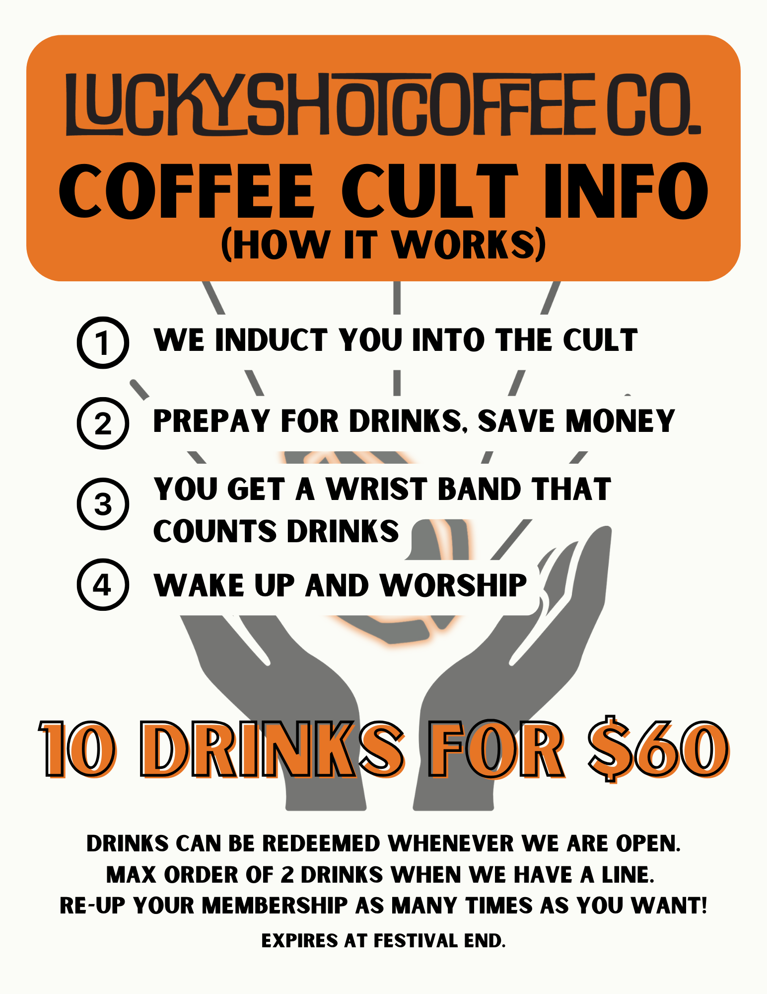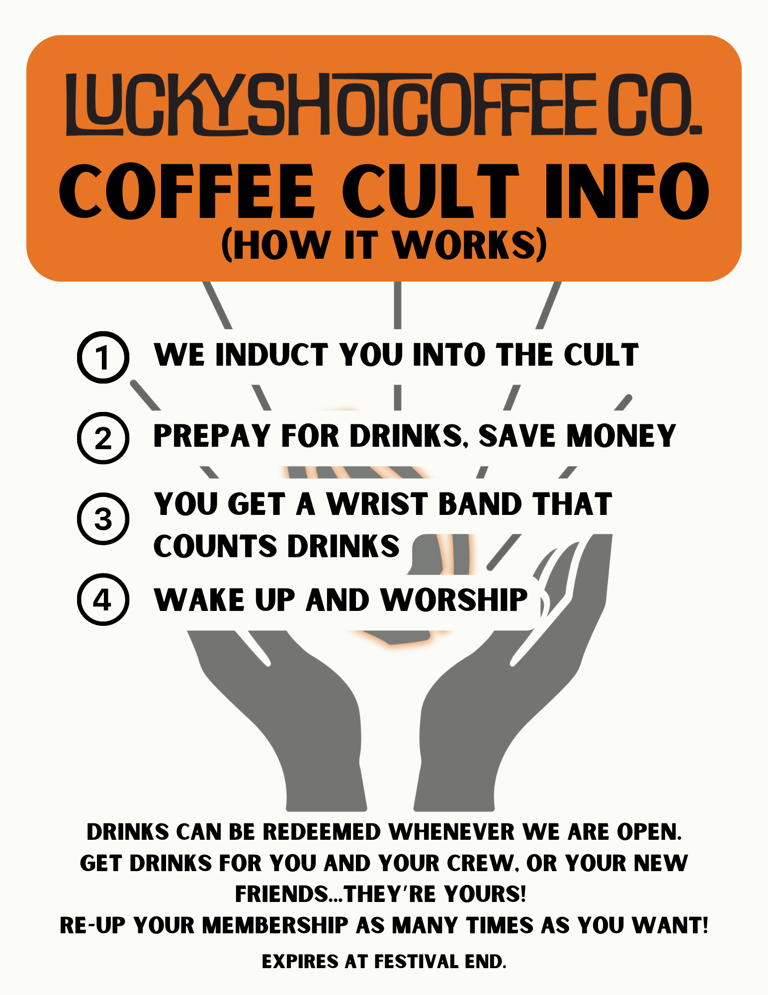 Ever wanted to join a cult? What about save money at the same time? YOU’RE IN LUCK. Our Coffee Cult Membership is something we ONLY offer at the festivals we vend at. We love building community wherever we go…and we especially love our Cult Members! You can become a member at the event, but…..